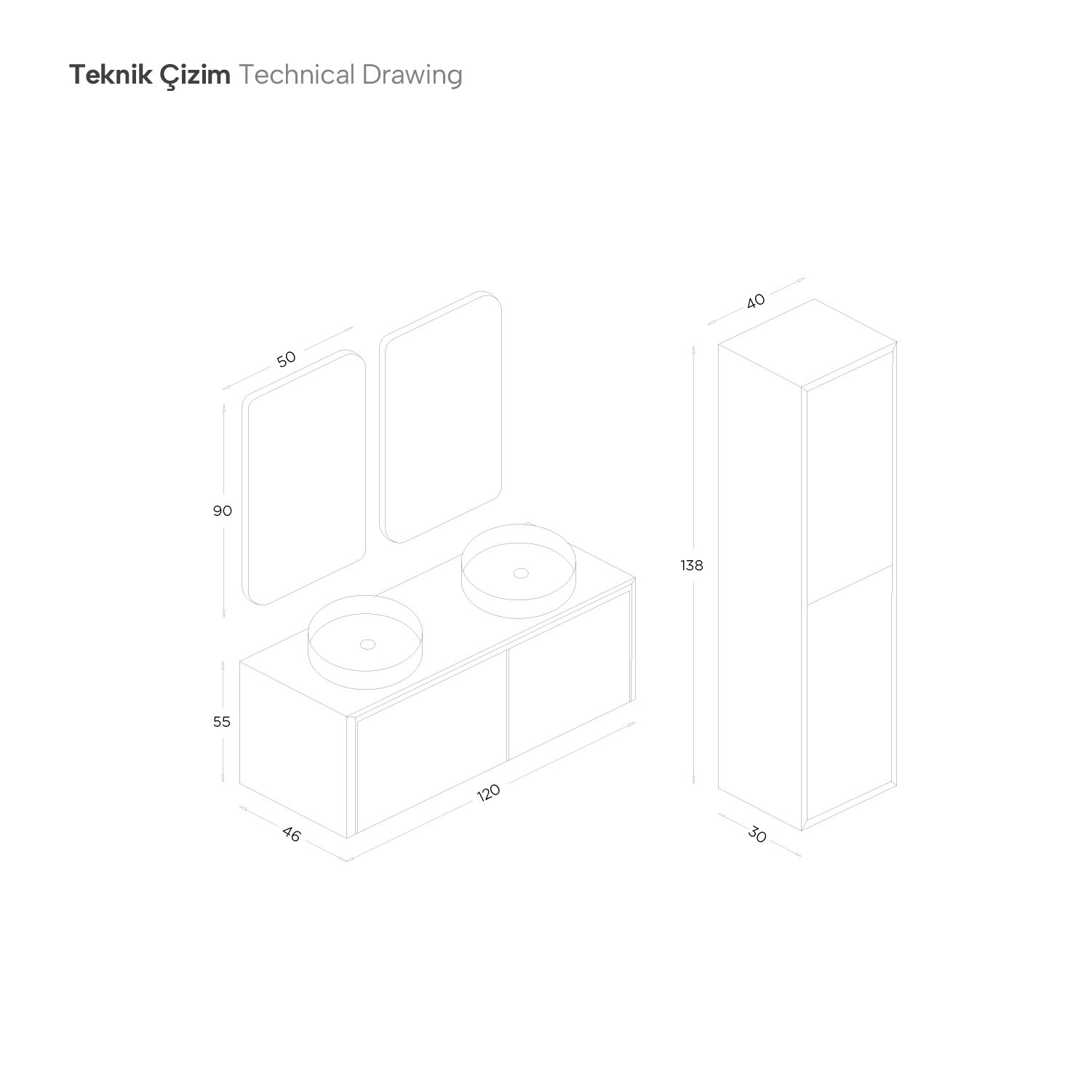 Boyutlar: Alt Modül: 120 cm / Ayna ( Çift ): 51cm / Boy Dolap: 40 cm