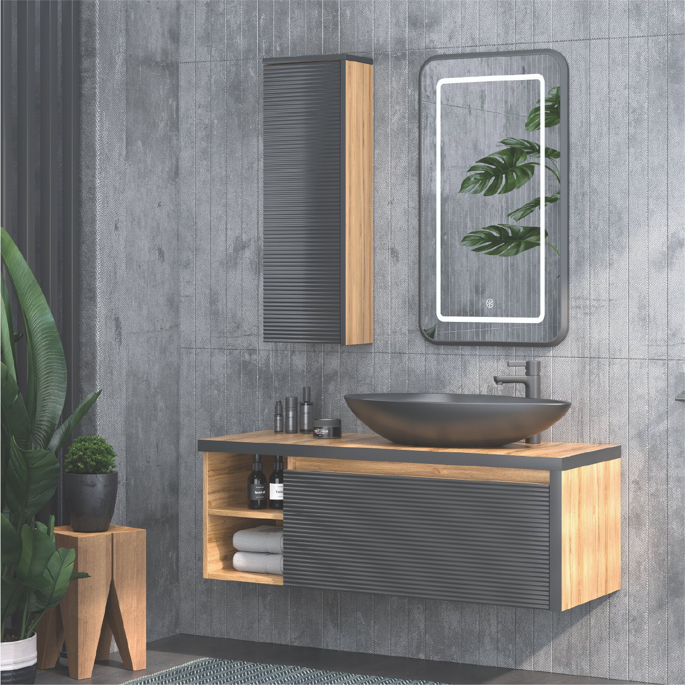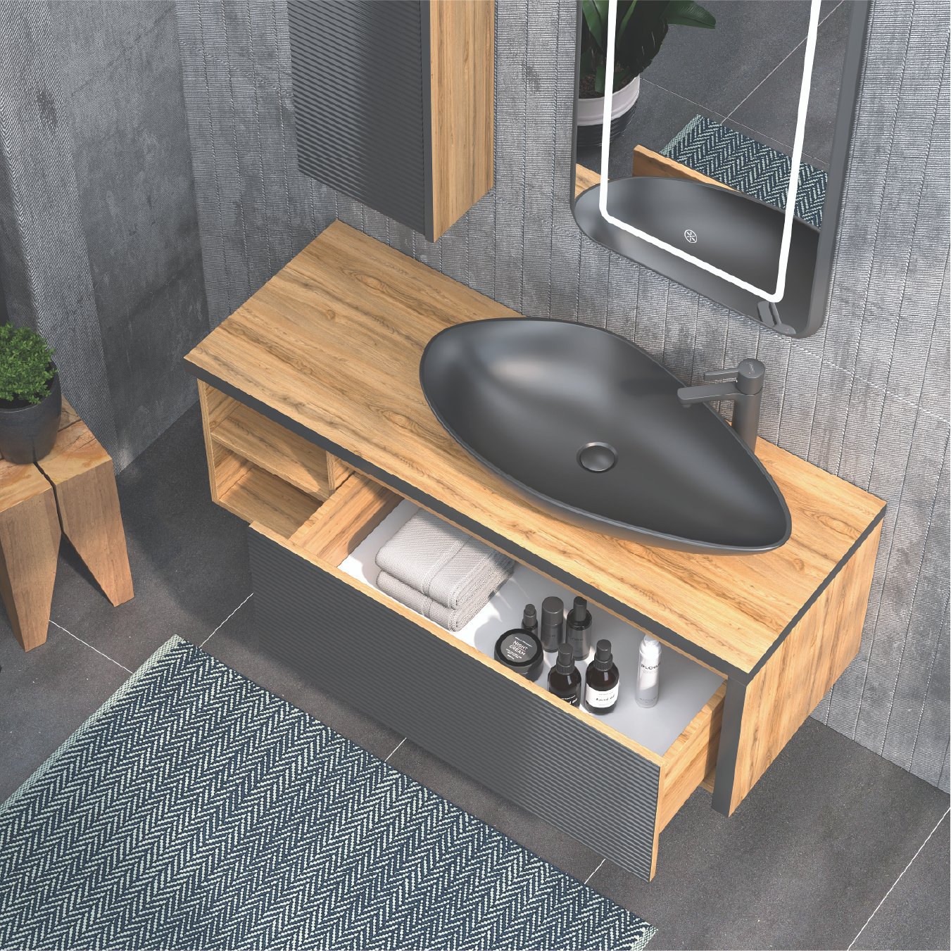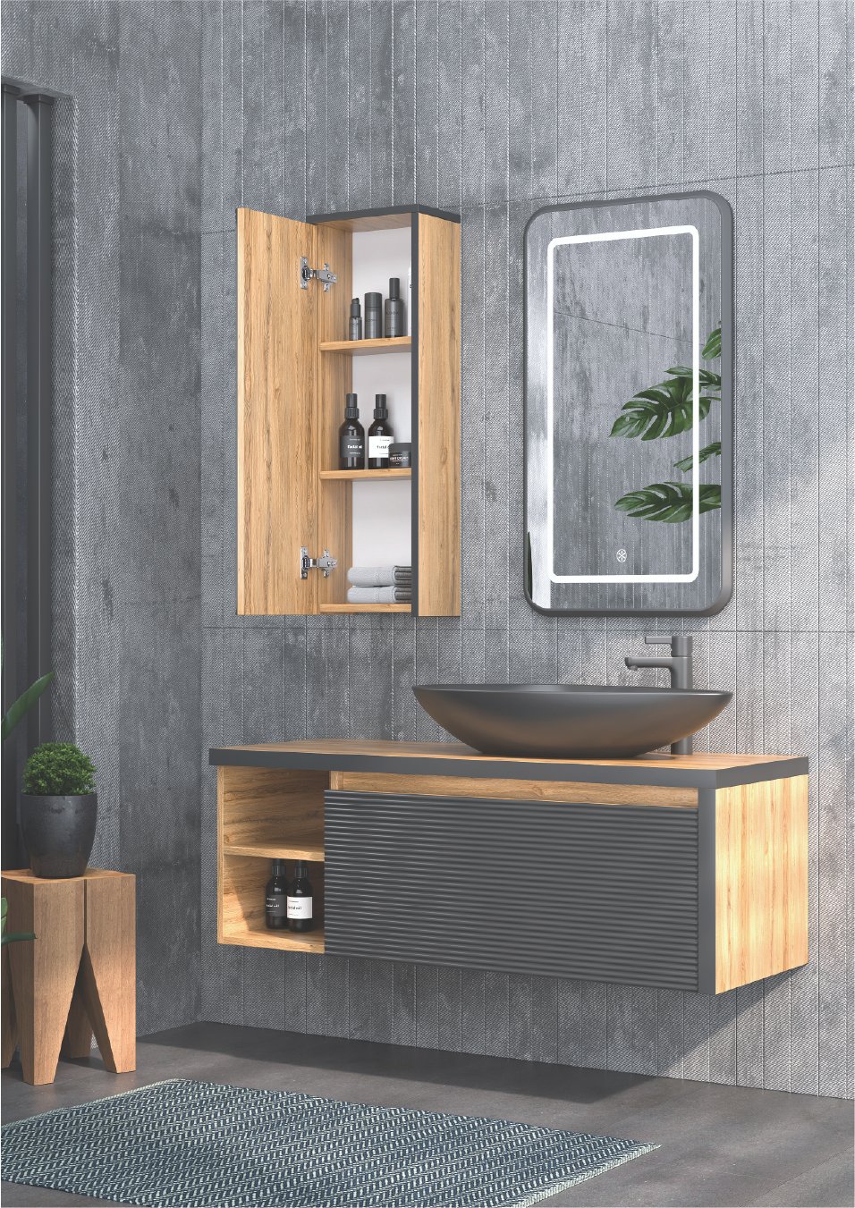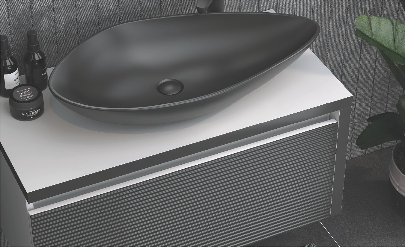 Dokunmatik, Akrilik Ledli Ayna Tezgah Üstü Lavabo Çekmeceli / Nervür Kapaklı Alt Modül Mdf Lam Gövde, Mdf Lam Kapak ve Çekmece Çekmeceli / Nervür Kapaklı Üst Blok