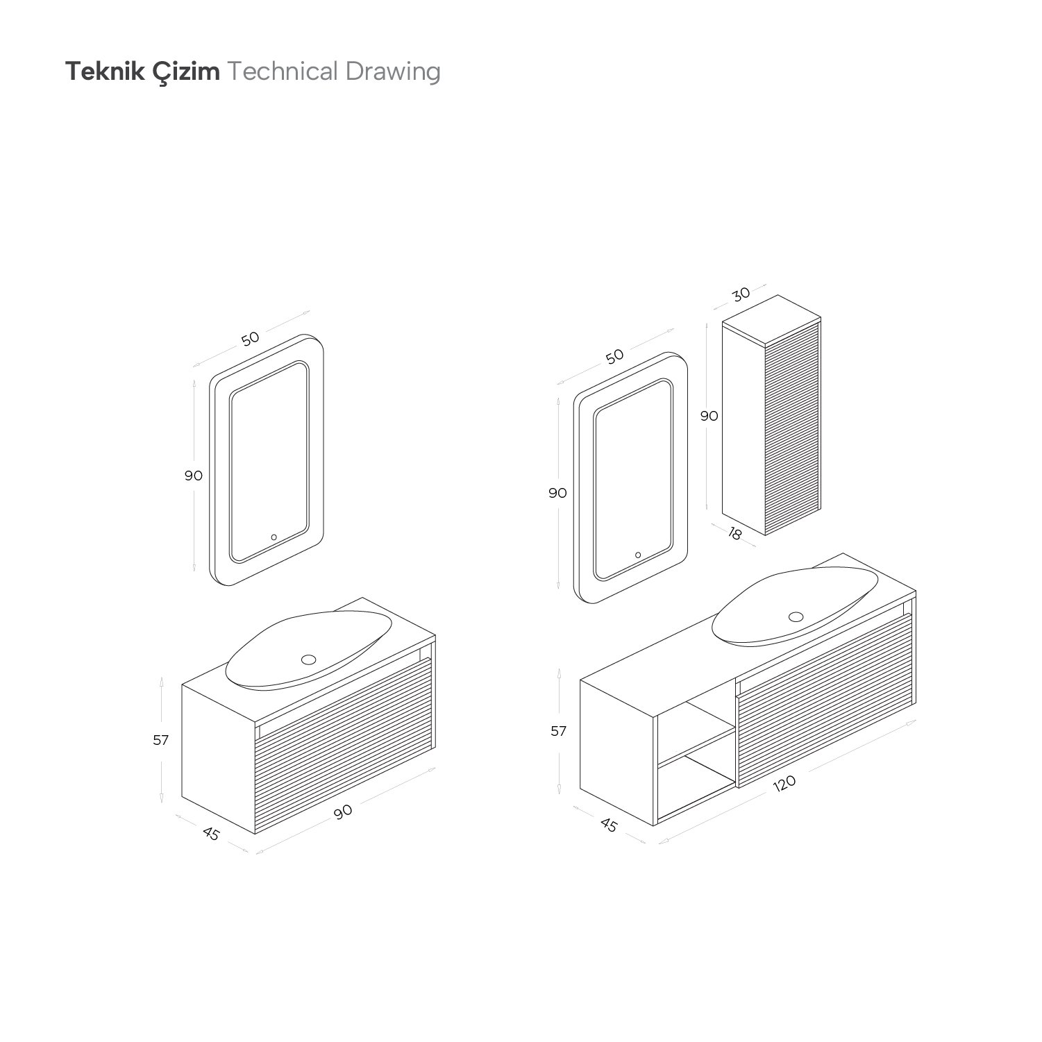 Yükseklik: 90 cm Luna:Alt Modül: 57 cm / Ayna: 90 cm120 cm Luna:Alt Modül: 57 cm / Ayna: 90 cm / Yan Modül: 90 cm