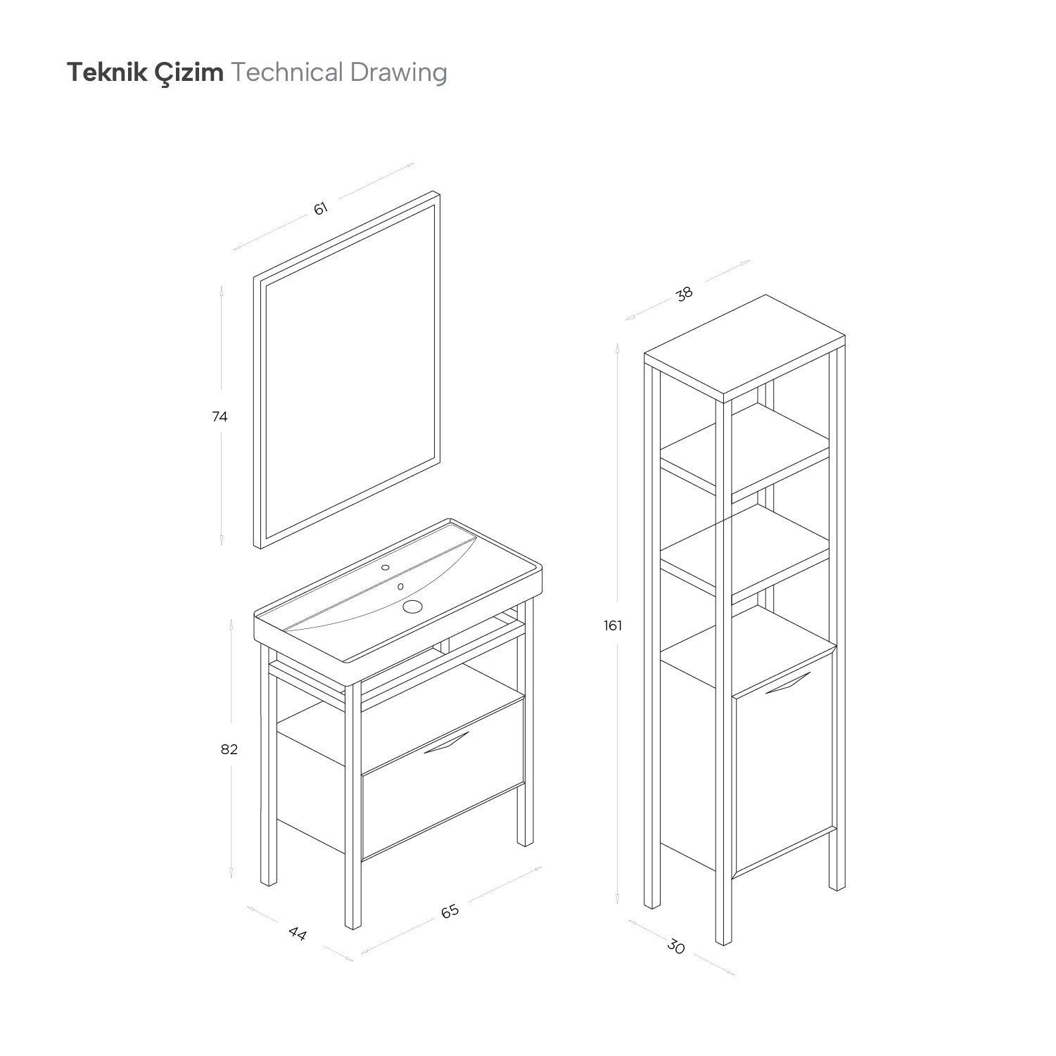 Boyutlar: Alt Modül: 65 cm / Ayna: 61 cm / Boy Dolap: 38 cm