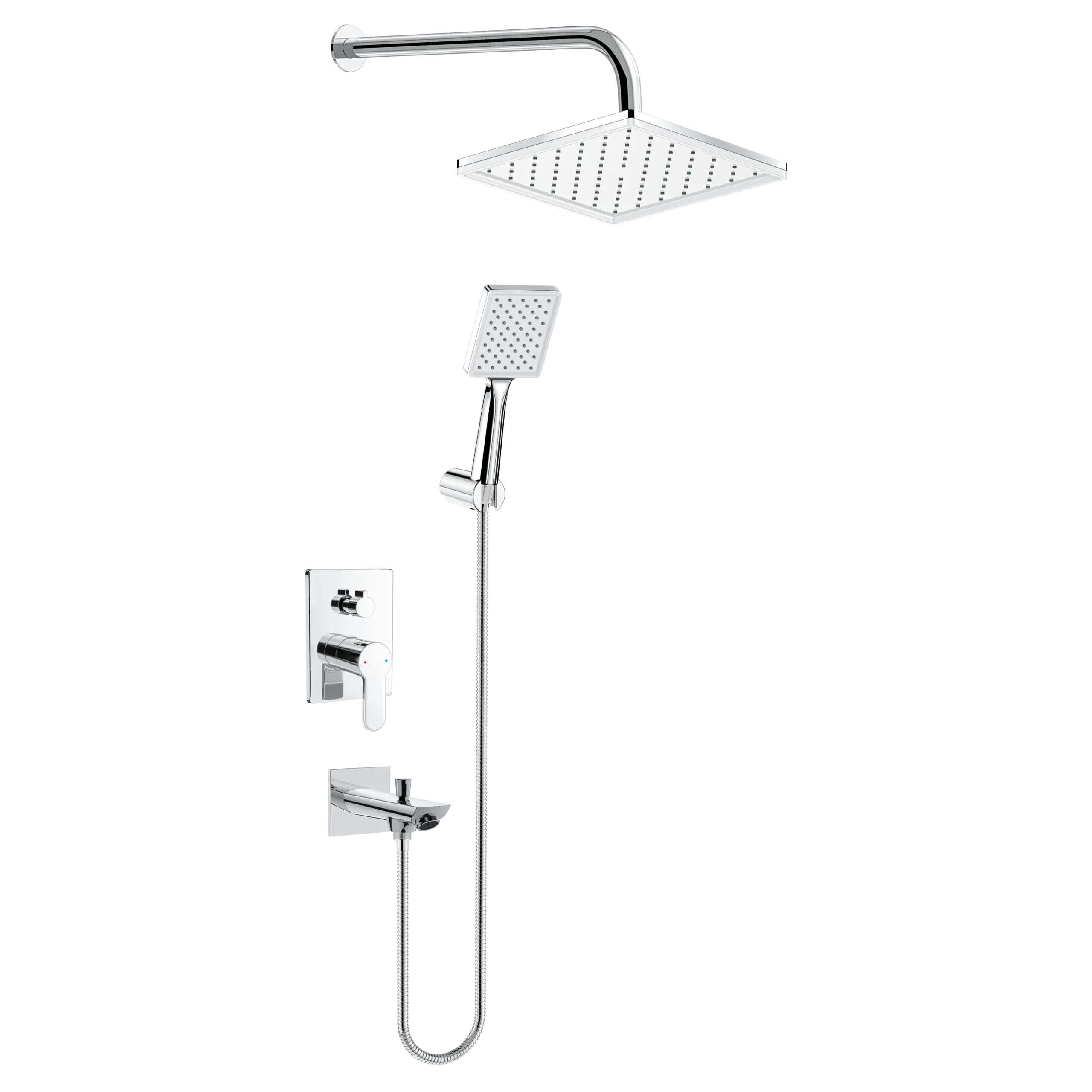 • Pirinç kare krom duş bataryası 2 yönlü• 90×110 mm krom el duşu VS-9172& 220×220 mm krom duş başlığı VS-9425 / Tepe duşu• 35 cm-Ø20 mm paslanmaz çelik krom duşborusu• 150 cm Pirinç ek parça, paslanmaz çelik krom duş hortumu•Askılı krom su çıkış dirseği4 Adet