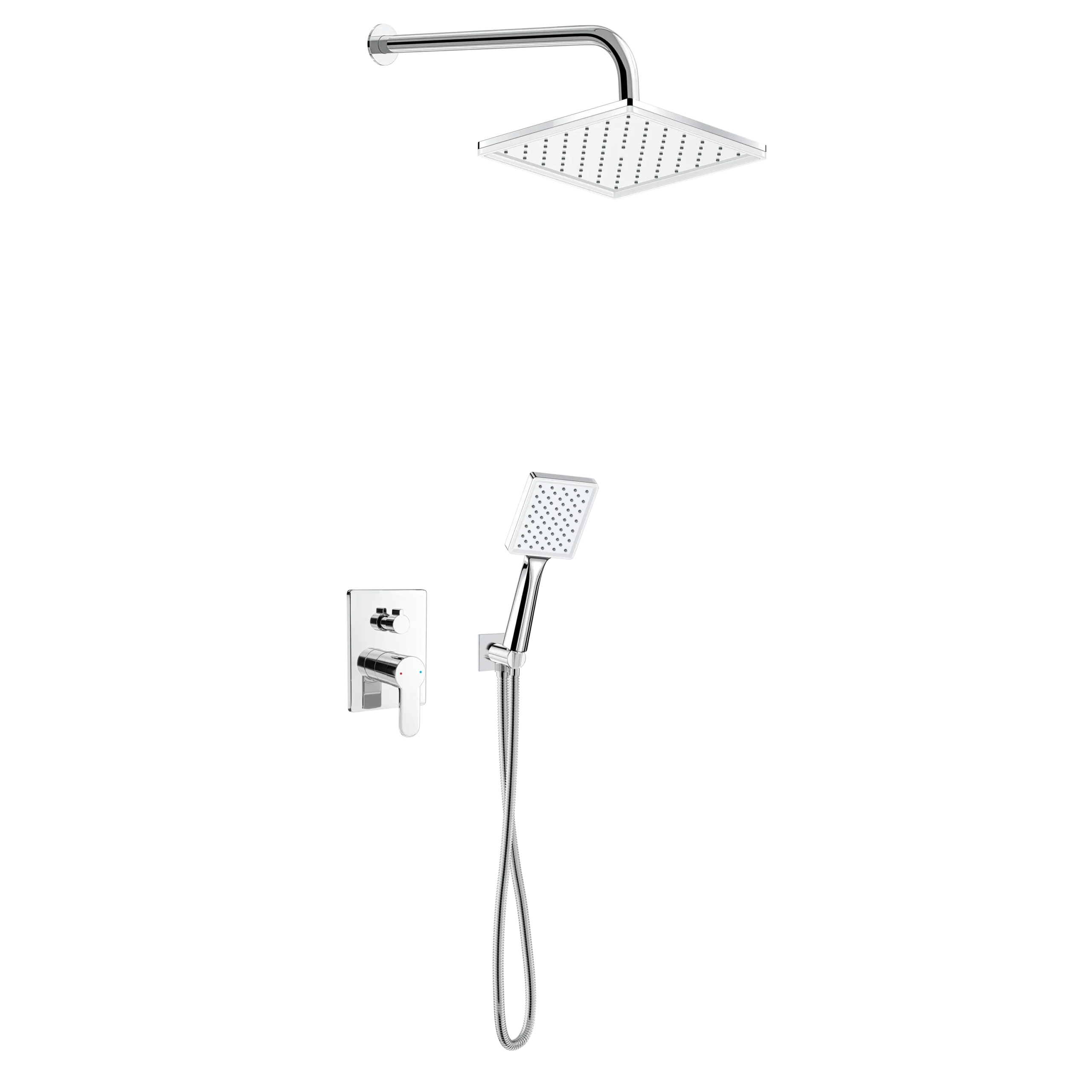• Pirinç kare duş bataryası 3 yönlü – Krom•90×110 mm krom el duşu VS-9172& 220×220 mm krom duş başlığı VS-9425 / Tepe duşu• 35 cm-Ø20 mm paslanmaz çelik krom duşborusu• 150 cm Pirinç ek parça, paslanmaz çelik krom duş hortumu•Askılı krom su çıkış dirseği•Kare pirinç krom su çıkış ucu4 Adet