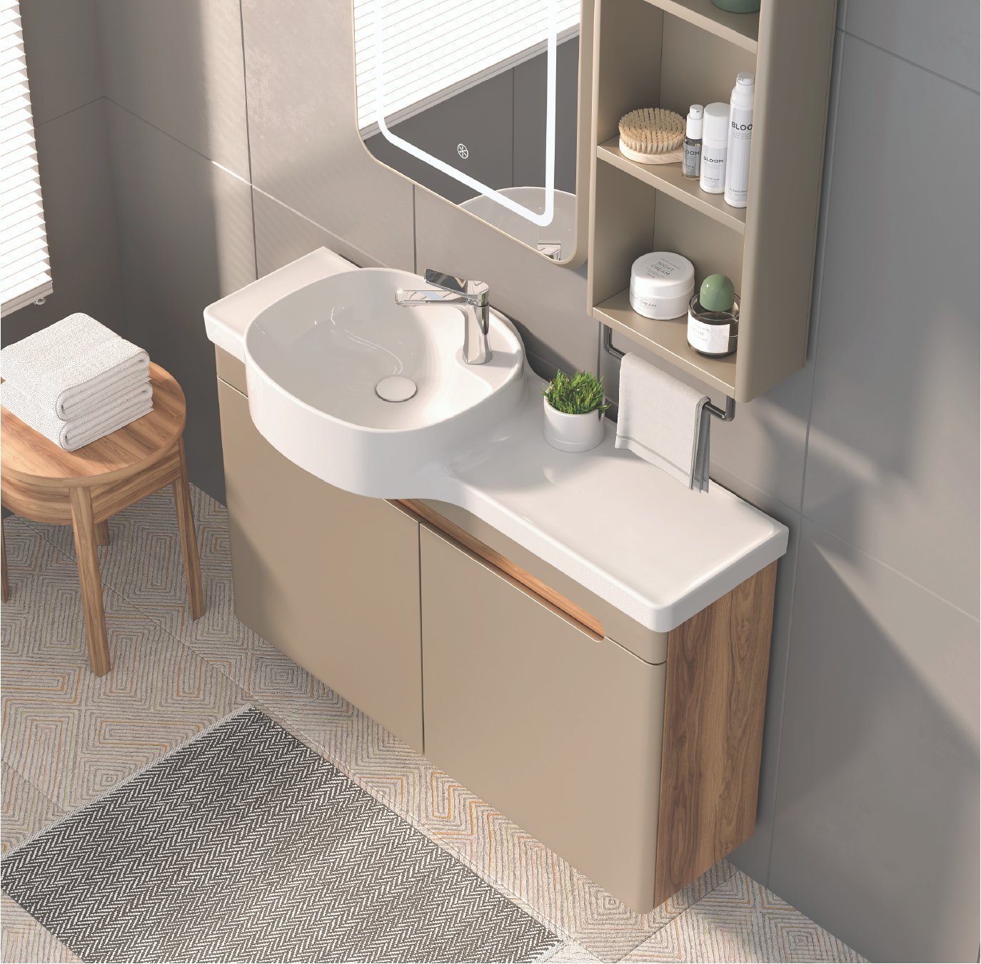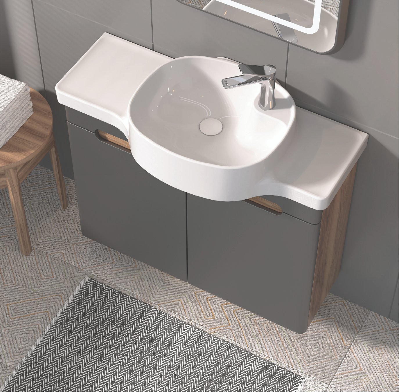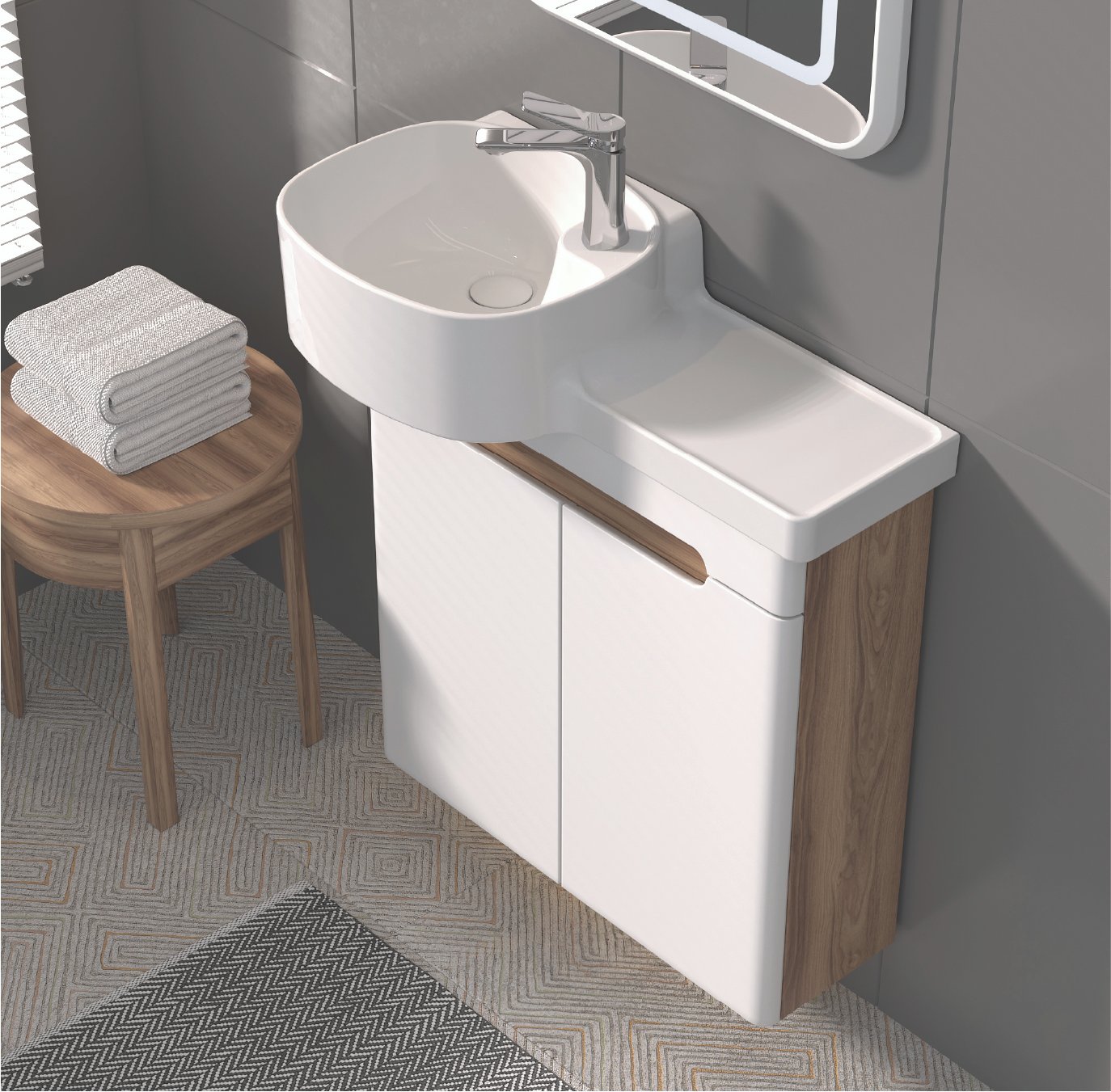 Dokunmatik, Akrilik Ledli Ayna Havluluklu Açık Raf Etajerli Lavabo Kapaklı Alt Modül Mdf Lam Gövde, Mat Lake Kapak Mat Lake Çekmece Çift Kapaklı Boy Dolap