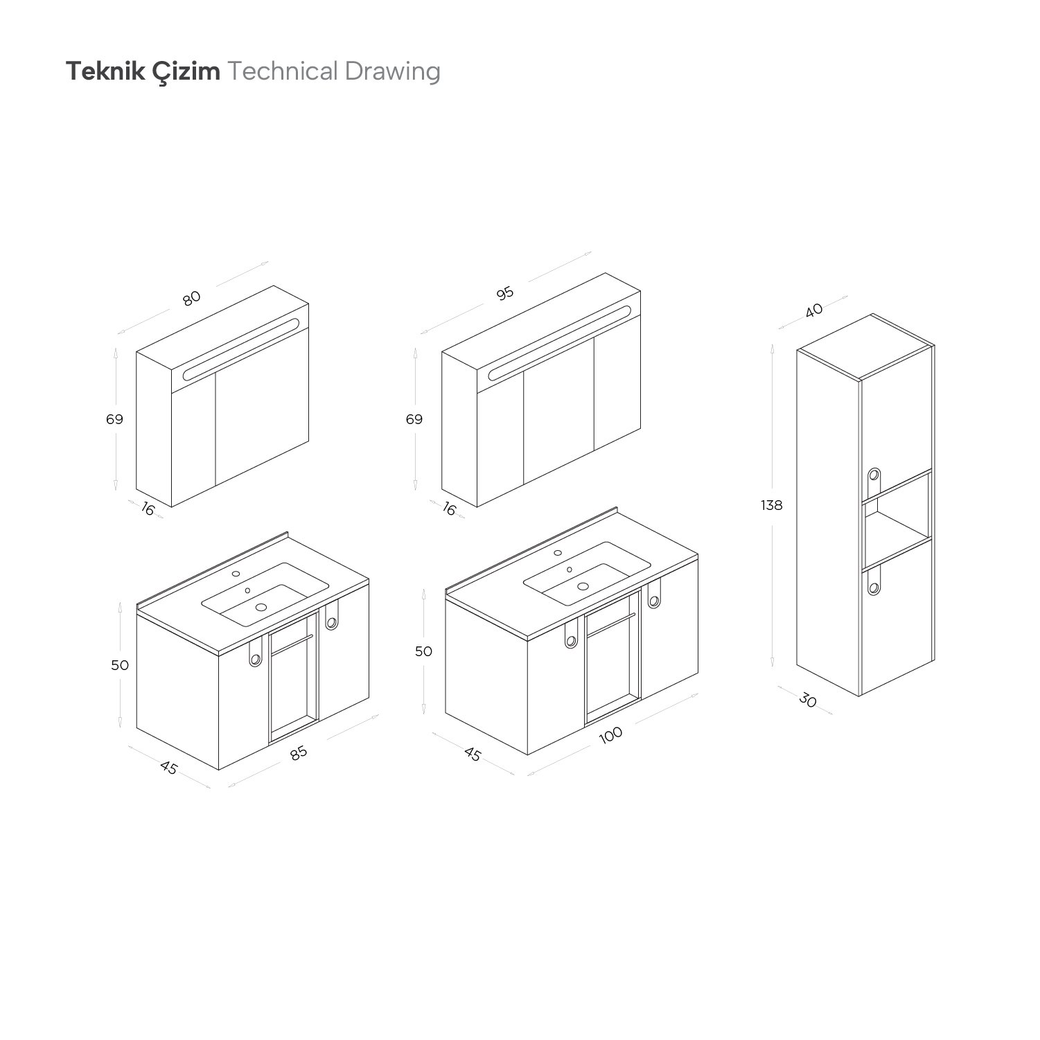 Yükseklik: 85 cm Zaria:Alt Modül: 50 cm / Üst Modül: 69 cm / Boy Dolap: 138 cm100 cm Zaria:Alt Modül: 50 cm / Üst Modül: 69 cm / Boy Dolap: 138 cm