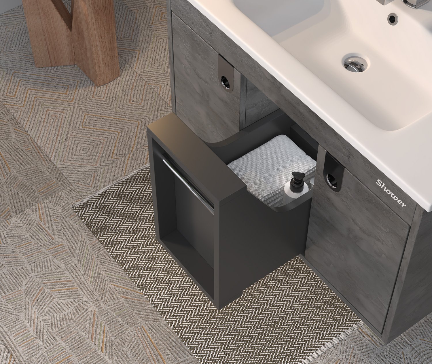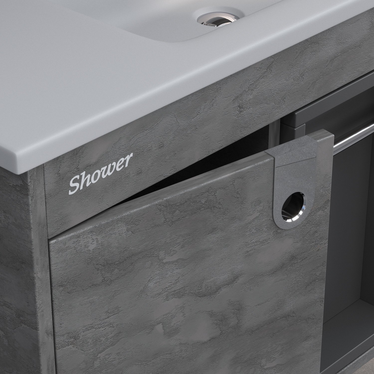 Etajerli Lavabo Mdf Lam Gövde, Mdf Lam Kapak Ve Çekmece Ledli, Aynalı Üst Modül Açık Raflı Boy Dolap