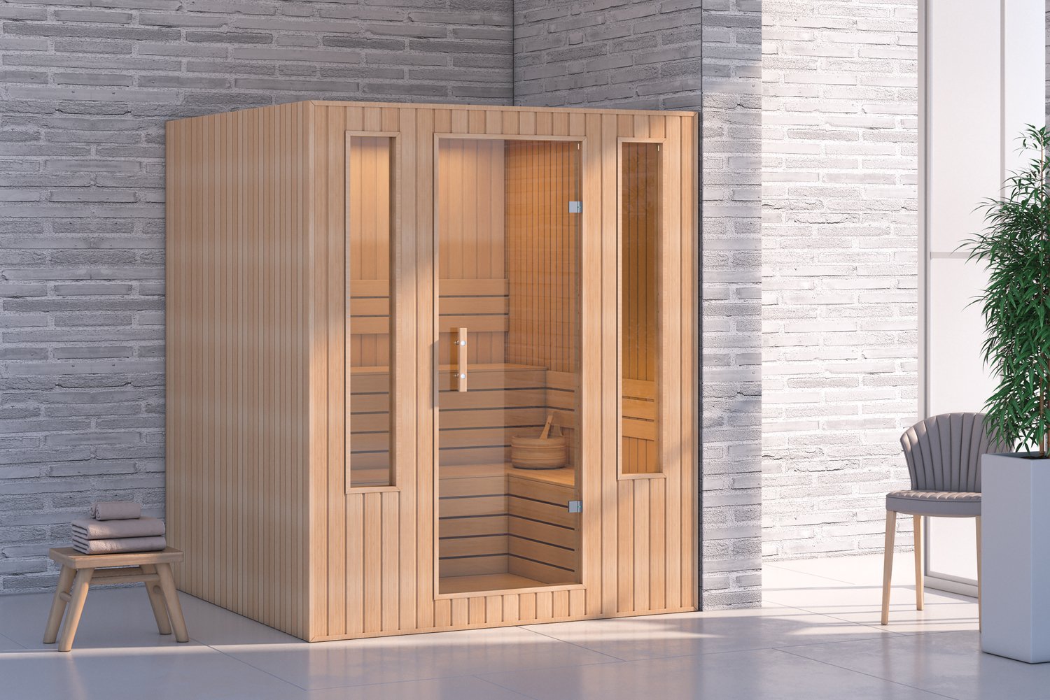 Ahşap Duvar, Zemin, Tavan ve Oturak | Su Kovası, Kepçe | Termometre | Higrometre | Kum Saati | 3 Kw Sauna Sobası | Aydınlatma.